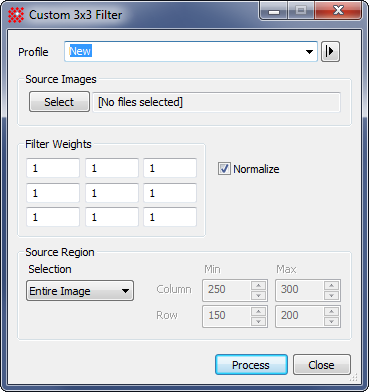 The Custom 3x3 Kernel command convolves a user-specified 3x3 kernel. This is a simplified version of the Custom Filter Kernel. The filter kernel contains numeric weights applied to values in the neighborhood of each target pixel. The kernel values are actually weights applied to pixels in a 3x3 neighborhood centered on each target pixel in the image. The kernel weights may be normalized to a "volume" of 1.0 without typing in normalized values.