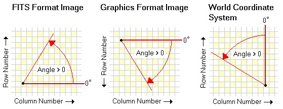 Different image formats are displayed with their origin in different relative locations in the image window. The convention for FITS format is to display the image with the origin in the lower left corner but other formats display the origin in the upper left corner. This means that angles are measured differently in FITS format and other formats. The convention for graphics software is to measure positive angle going clockwise from the positive x axis but it may be different for a FITS image that does have or does not have a World Coordinate System Calibration. Therefore, to accommodate all conventions, angle measurements follow a different sense when measured in different format images: