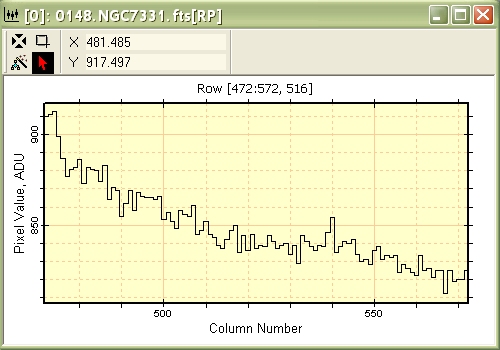 The first figure below shows the Row Profile plot in the Pixel Coordinate System. The x axis measures position as a column number on the image. The plot caption "Row [472:572, 516]" indicates that the plot data are from columns 472 through 572 (101 total columns) in row 516.