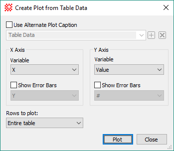 Making a scatter plot is a 1 or 2 step process, depending upon whether you want to plot values from all rows of the table (one step process) or you want to plot values only from selected rows (two step process). In the two step process, the rows must be selected in the Report Window (see row selection under Grid Context Menu). In both cases, the data columns are selected from among the columns of the table. To plot the entire table, use one of the two methods shown below. To plot data only in selected rows, you must first select the rows before executing the Create Plot from Grid command; see Selecting Cells in a Grid Control.
