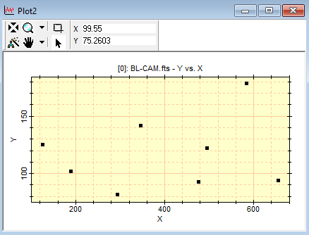 The Plot Window below compares the Y coordinate ("Y") versus X coordinate ("X") from the table of Point Measurements for an image.
