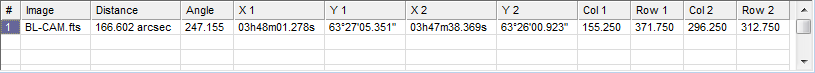 If the image has a World Coordinate System calibration, then distance is measured in arcseconds and the angle in degrees is reported as a Position Angle (PA). Position angle is measured with 0 aligned North, with increasing angle measured through east (with increasing right ascension). See Angle Measurement Definition.