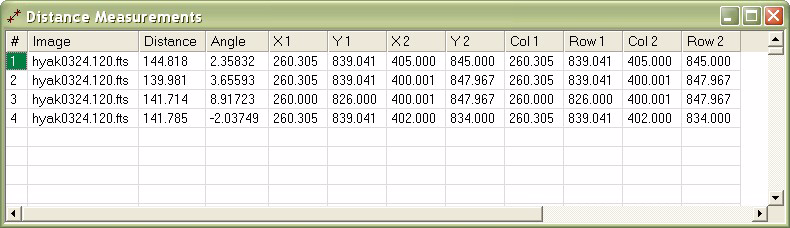 The 4 measurements from above are tabulated below in the Distance Measurements window. Notice that this image does not have a WCS Calibration, so the distance and angle are reported in units of pixels and trigonometric angle. If it did have a WCS calibration, distance and angle would be reported in arcseconds and position angle and the endpoints X1, Y1, X2, and Y2 would be reported in right ascension and declination rather than column and row coordinates.