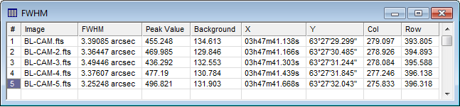 The example above shows results for images having a World Coordinate Calibration ("WCS") with FWHM results in arcseconds and the X,Y values in terms of Right Ascension and Declination. If the images do not have a WCS calibration, the results are listed in units of pixels.