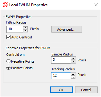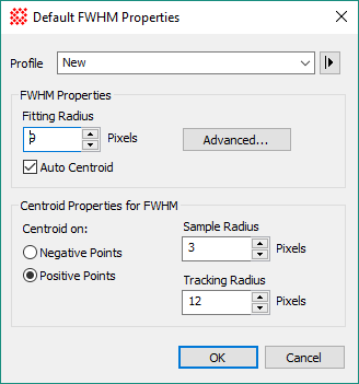 FWHM Properties control Full Width at Half Maximum ("FWHM") measurements of point sources. These properties can be changed globally, to make default settings for new image windows, or locally, to affect FWHM measurements only in the specific window. The default properties dialog uses a profile control to save and recall parameter sets for use by future image windows. Local properties affect only the specific Image Window for which they are changed.