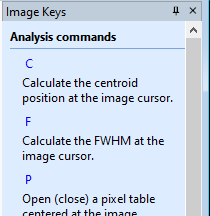 The Image Keys Pane is a docking pane that accesses all keystrokes and command shortcuts for Image Windows. This is a "task window", a form of help window that provides both a short description and a hot link for executing tasks. It is both useful for learning the many keyboard commands of Image Windows and for executing the tasks directly, for example when the window has an active command marking mode like Aperture Photometry or Point Measurements that may render keyboard commands inactive. The colored links in this pane execute the command regardless of the Image Window's command mode. Thus, it may be useful to keep this pane handy as a tab on window border. To preserve the state of this and other docking panes for future Image Windows, save using the Docking Panes command.