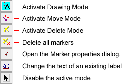 Labeling refers to drawing text and markers on a displayed image. The displayed labels can be copied with the image for use in graphics arts software or other applications. Adding labels uses the Label Toolbar, which is opened from the Image Measurements Toolbar. The toolbar opens with Marking Mode active.