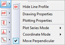 Since the Move Perpendicular option applies to adding lines to an existing profile plot, it is grayed out until the first line is drawn and the toolbar is switched to Move mode. The Hide Line Profile command appears because this drop menu was opened while the Line Profile Toolbar was open. If the toolbar is not open, the first command isLine Profile Toolbar, which opens the toolbar.