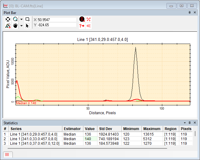 Move the Line Profile line to a third location. This results in a total of 3 plot series appearing in the Plot Window.
