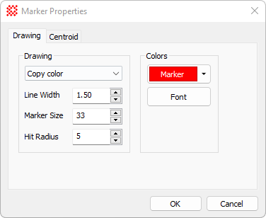The Marker Properties dialog is a generic Properties dialog used by Mira commands that mark a line on an image. Each instance of the dialog uses the name of the parent procedure. For example, the dialog shown below appears for the Point Measurements package.