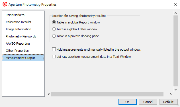 Table in a global Report window Photometry output is sent to a table in a Report window. The window is automatically created. Text in a global Editor window Photometry output is sent to Text Editor window. The window is automatically created. In this case, the columns will be misaligned unless you set the Editor to use a fix-pitch font, such as "Courier". Table in a private docking pane This is similar to the global Report window except it uses a pane that is private to the Image Window. |