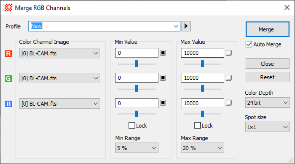 Use Samples from the Images. In this method, you choose pixel values from the R, G, and B images to specify actual values for Min Value andMax Value. This methods works only if the R, G, and B images are in an Image Set in the same window, because it uses the Image Cursor to load a sample of each image at the same location. To do this, you must select theMin Value before the Max Value. Simply move the image cursor onto a region you want to be absolute black in the merged image and click [Load] in the Min Value column. Then move the image cursor onto a region of the images that should be the lowest white value (i.e., the saturation point above which everything is pure white) and click [Load] in the Max Value column. You can adjust these values afterward to change the color balance, brightness or darkness, or the contrast.