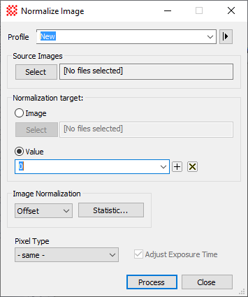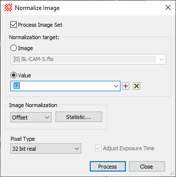 The Normalize Image command adjusts the image intensity to match a target specification, such as a specific value or a statistical intensity inside a region. A common application of this command is to match the brightness (intensity) of an image set. This dialog has two forms: a general form accessible as a menu command, and a specific form for a displayed image set that opens from the Animation Bar and processes only that specific image set. Normalize Image Set is opened only from a displayed image set; Normalize Images can take source images from an image set of files.