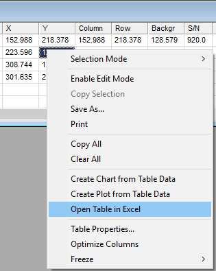 The Open Table in Excel command appears in right-click menus for most data tables in Mira. The menu shown below appears in the Aperture Photometry package.