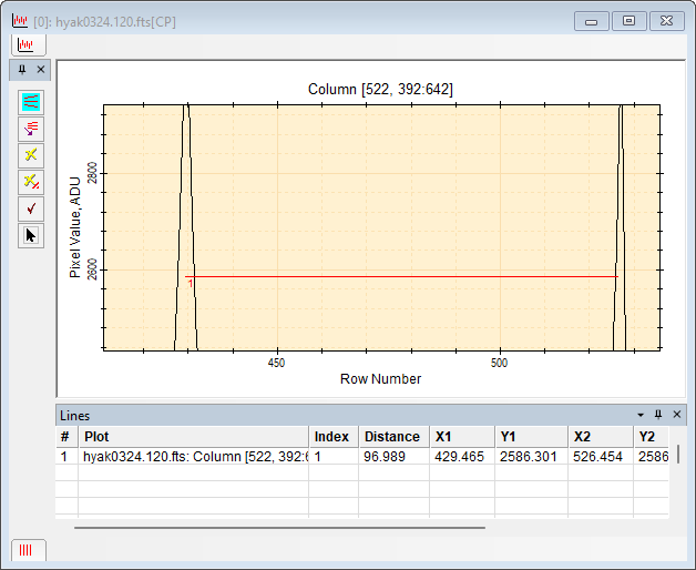 The following picture shows a Plot Window with a line marking the (x,y) coordinates of two peaks. Measurement results accrue in the Lines Docking Pane which opens at the bottom of the window.