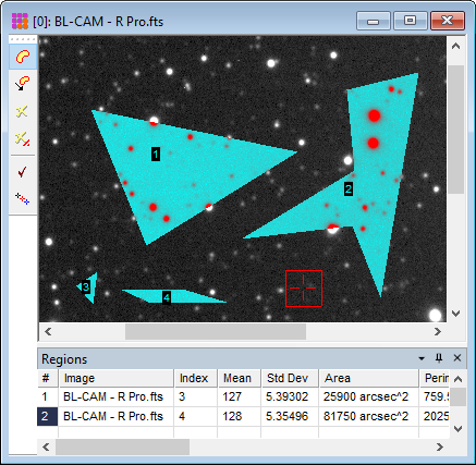Measurements are tabulated in either the Region Measurements measurement pane owned by the Image Window as shown above, or a Report Window as shown below. The difference between the two output options is that the Regions measurement pane receives only measurements of that Image Window whereas the Region Measurements window is global and receives measurements from all Image Windows.