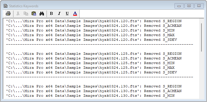 The Remove Statistics Keywords command finds and deletes all the Statistics measurements found in the image header. The deleted keywords are confirmed by listing them in a Text Window.