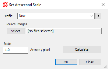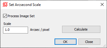 The Set Arcsecond Scale command attaches a linear arcsecond scale to the X and Y axes of the image. This gives you the option to get positional readout, plots, and measurements in units of either arcseconds or pixels. This command can also use the Calculate Image Scale command to calculate a value for the camera and telescope combination. The value is inserted into the Scale field in the dialog, after which you would use [Apply] or [OK] to apply it to the image or image set.