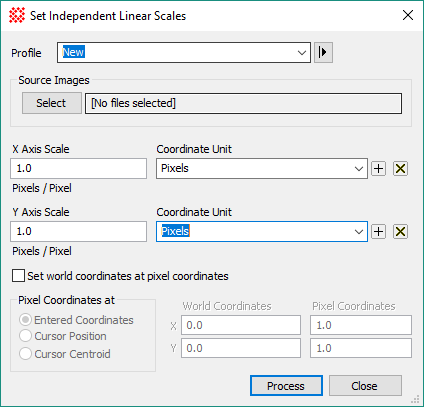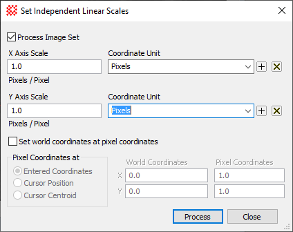The Set Independent Linear Axis Scales command attaches independent linear coordinate systems to the X and Y axes of the image. To set the same scale for both axes, you can also use the Set Linear Scale command. Keywords that define a world coordinate calibration are inserted into the image header by this command.