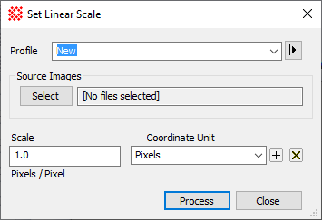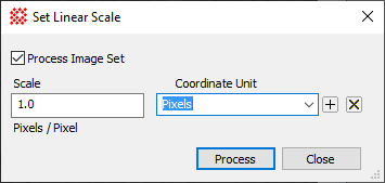 The Set Linear Scale command attaches a linear coordinate system to the X and Y axes of the image. The scale is equally applied to both the X axis and Y axis. To set independent linear scales, use the Set Independent Linear Scales command. Keywords that define the calibration coefficients are inserted into the image header by this command.