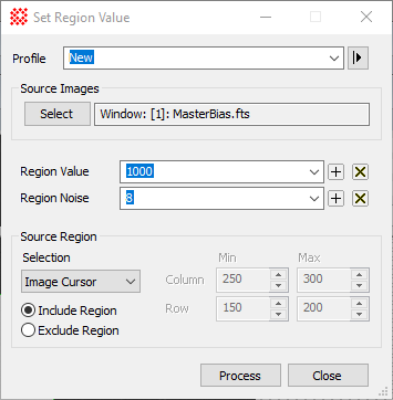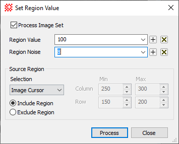The Set Region Value command changes the pixel values inside or outside a rectangular region of interest (ROI). Pixels in the target region are assigned a value plus or minus Gaussian random noise. The region may be explicitly specified or may be defined by the image cursor. The noise value may be set to 0 to assign a constant value..