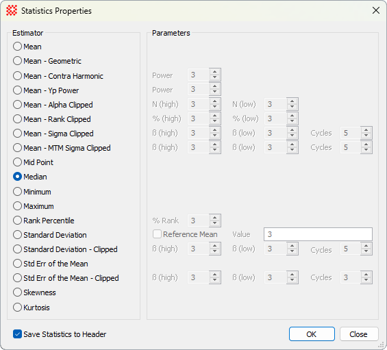 Most of the statistical estimators are also available for combining and normalizing images. See Statistical Estimators for Image Combining.