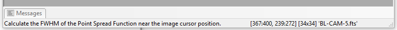 The Status Bar at the bottom of the Mira window frame lists command prompts and information about the Image Cursor. The let side lists a prompt when the mouse hovers over a menu item or toolbar button. The right side lists the Image Cursor bounding coordinates and size when the mouse is hovering over an Image Window.