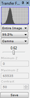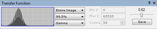 The Transfer Function Pane is used to interactively adjust the transfer function of an image. This docking pane attaches to the Image Window and is available in both horizontal and vertical formats. It may also be undocked from the window entirely. The stick-pin allows you to reduce the pane to a tab which opens and hides from the window border.