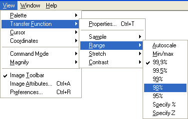 Transfer Function settings can be changed from popup windows similar to the way they are changed using the Transfer Function Pane dialog. One of the menus is shown below. All of the Properties available in this menu tree are described under Transfer Function Definition.