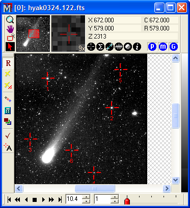Before starting to register the images, it is a good idea first to examine the images you have opened. Perhaps some images are poor quality or you have other reasons not to align them. You need to do any image set adding, deleting, or re-ordering before starting Image Registration (or Photometry) since these adjustments are not allowed while the image registration package is active. To examine the images, move the red thumb on the trackbar in the Animation Bar at the bottom of the Image Window. If you need to change the images in the image set, see Changing the Image Set.