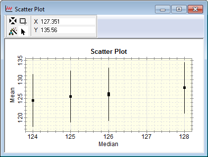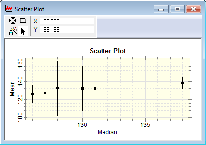 This produced the following scatter plot. As you can see from the report, the median value is identical for measurements 3 and 5. This produced two nearly-overlapping points in the plot.
