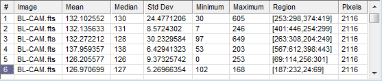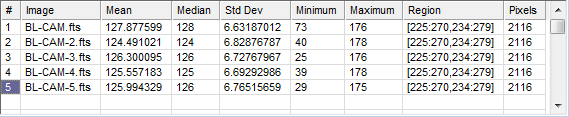 Another example of a measurement that is quick to get involves opening a series of images as an image set, then making a single statistics measurement at one location of the Image Cursor. The statistics report looks like the following: