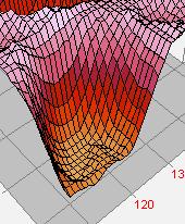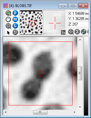 This is the original image displayed in Mira and magnified 4X. The region inside the Image Cursor was rendered using the 3-D Surface Plot command. A section of that 3-D plot is shown below using various options available from the 3-D Drawing Attributes window.