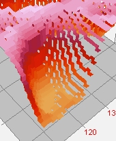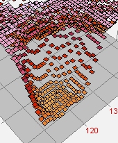 This Intensity Surface plot uses a Stepped Ribbon Pixel Representation with overlay Grid enabled. A pseudocolor palette is used to delineate by Z value. A Ribbon plot makes the rendering "transparent" in the column direction, meaning that you can view data at different row (Y) positions from any column (X) position.