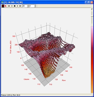 Intensity Surface Plot with Pedestal Pixel Representation and Overlay Grid enabled. This representation shows each pixel as a "column" of data in the Z direction.