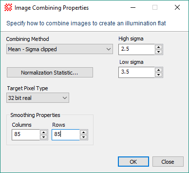 The [Combining Strategy...] button opens the Image Combining Properties dialog for configuring how pixel values are combined in the final processing step, after bias and dark corrections are applied to the raw flat frames. For a description of the properties set in this dialog, see the Image Combining Methods and Region Statistics topics.