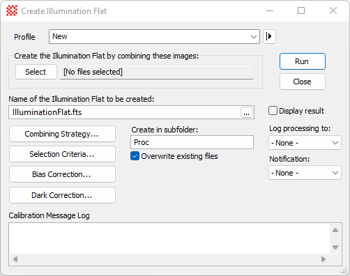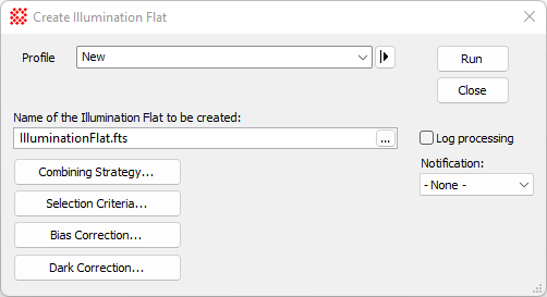 The Create Illumination Flat command combines flat frames to create an illumination correction image that maps variations in illumination. Usually these variations are taken to be independent of wavelength, whereas the correction for sensitivity variations, which are dependent on wavelength, are accomplished using a Pixel Flat. The individual flat frames may be calibrated during processing by applying bias and dark corrections, then combined to create the master flat having higher signal to noise ratio than any single flat frame.