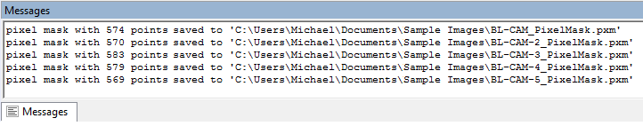The result of this command is a collection of pixel coordinates saved as a Pixel Mask File of typepxm. The pixel mask is saved in the folder of the source image, using the same file name, with "_PixelMask.pxm" appended to the image name. A summary of results is listed in the Message Pane.