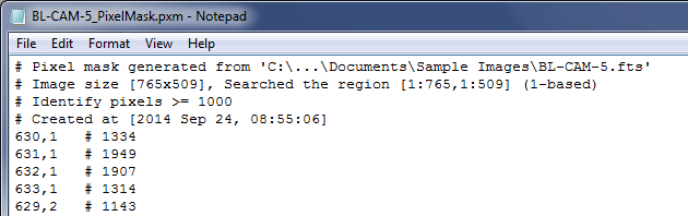 The pixel mask created from the 5th image of the image set was opened in Notepad as shown below: