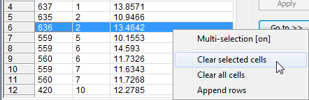 The Pixel Mask Editor contains a data grid that lists the (column,row) coordinates of each mask location. The currently loaded pixel mask file is named in the edit field at the top of the window. Pixel mask files have a pxm file name extension. Several important commands related to the data grid are located in a right-click context menu as shown below. To delete all values in a row, highlight the row and then right-click to open the menu and choose Clear selected cells.