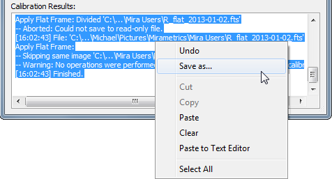 Commands for editing and copying the text from the dialog's message area are available in a pop-up menu. Open this menu by right-clicking inside the Calibration Messages area. The Text Editor offers similar commands as well as capability for printing.