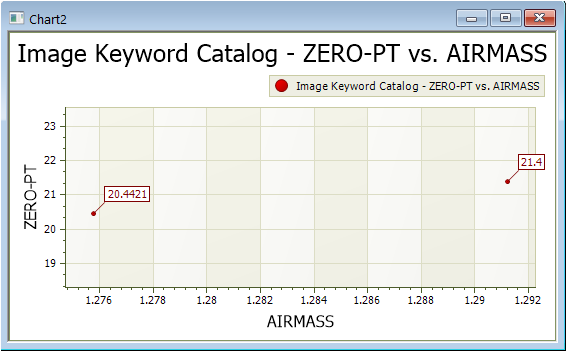 The Create Chart from Grid command in the menu is used for graphing the photometric zero point (ZERO-PT keyword) against the airmass of the observation (AIRMASS keyword). The two pictures below show the Create Chart from Grid dialog and the chart (graph) created by clicking [Plot] on the dialog. In this example, notice that only 2 points appear in the chart because only two of the images have values for both keywords.