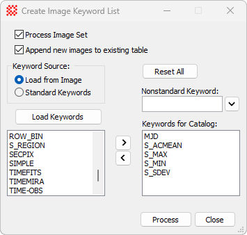 Select where the keywords are obtained: Load from Image scans all target images to collect keywords from all headers. Standard Keywords lists the set of keywords recognized by Mira. |