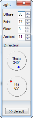 The 3-D Light Source ("Light") dialog sets the position and properties of the light source for illuminated surface plots. This tool window may be open while you do other things in Mira. Settings in the window are those of the current 3-D Plot window having focus.