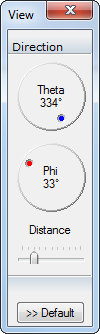 The 3-D Viewpoint ("View") dialog sets the viewpoint position relative to the plot surface. The adjustments are made relative to an azimuth of 0, looking into the X axis, and an elevation of 0, with the XY plane viewed edge-on. This tool window may be open while you do other things in Mira. Settings in the window are those of the current 3-D Plot window having focus.