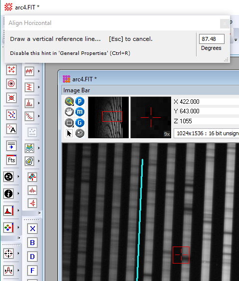 After launching the command, a Hint Window appears at the top of the screen, reminding you to mark the beginning corner (with the left mouse button down) and stretch the reference line along the direction of rotation. As soon as you launch the command from the menu or toolbar, the command is live and expects a line to be drawn on the image. However, the live command can be aborted at any time using the Escapekey or by right-clicking the mouse. The Hint Window can be moved and resized for the next time it opens and can be disabled/enabled using the checkbox in the General Properties dialog (Ctrl+R).