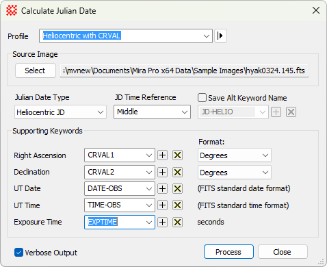 The Calculate Julian Date command calculates the geocentric or heliocentric Julian Date for an image and save the result in the image header. Note that the image must be saved to a file to make the addition permanent. Both the standard and modified forms are available as JD and MJD for regular geocentric Julian Date, or HJD and MHJD keyword for the Heliocentric Julian Date. The Julian Date can also be calculated and parsed using a simple script (see the sample script, "Julian Date Function Test.lua").