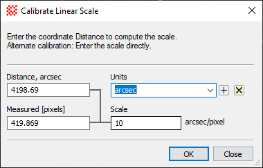 The Calibrate Linear Scale command works interactively to calibrate a linear coordinate scale for the image. The calibration is computed by drawing a line ("vector") of target length and specifying the world coordinate units and distance along the vector. The resulting calibration has equal scale in both x and y coordinates and is saved to the image header as a World Coordinate System. The coordinate units are specified in the calibration dialog.