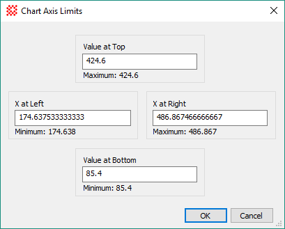 The Chart Axis Limits dialog is used to specify the exact limits of the plot inside the Chart Window. Only numeric limits larger and smaller than the listed Minimum and Maximum values can be set, and values inside these extremes will create a scrollbar along the corresponding chart axis. Initially, with no scrollbars, the numbers in the text boxes correspond to the Minimum and Maximum values.