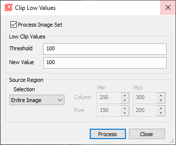 The Clip Low Values command removes extreme pixel values by clipping values below a specified threshold and replacing them with a target value. In comparison, the Clip High Values commands clips only high values. The similar Clip Pixel Values command combines both high and low clipping. Rather than using a fixed threshold, the related Cosmic Ray Filter uses a statistical test to detect isolated pixels or small groups of extreme values.